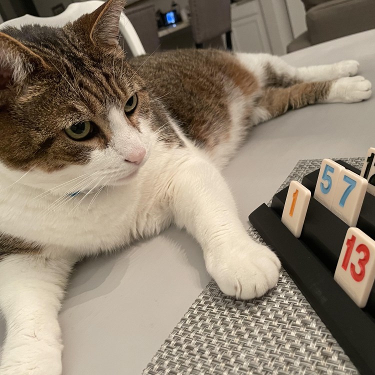 But Beamer had a different take on the game. As a feline, he prefers to to read his surroundings, the facial expressions of others, and things—rather than words. Rummikub is so easy, he told us with a long blink of his magnetic green eyes, that you don’t need to read any rules. It merely requires your full attention.