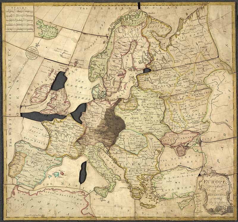 According to Wentworth Wooden Jigsaw Company, map engraver John Spilsbury created the first jigsaw puzzle a couple of centuries later. In 1762, he mounted one of his maps onto wood and then cut around the countries to help school children learn geography.